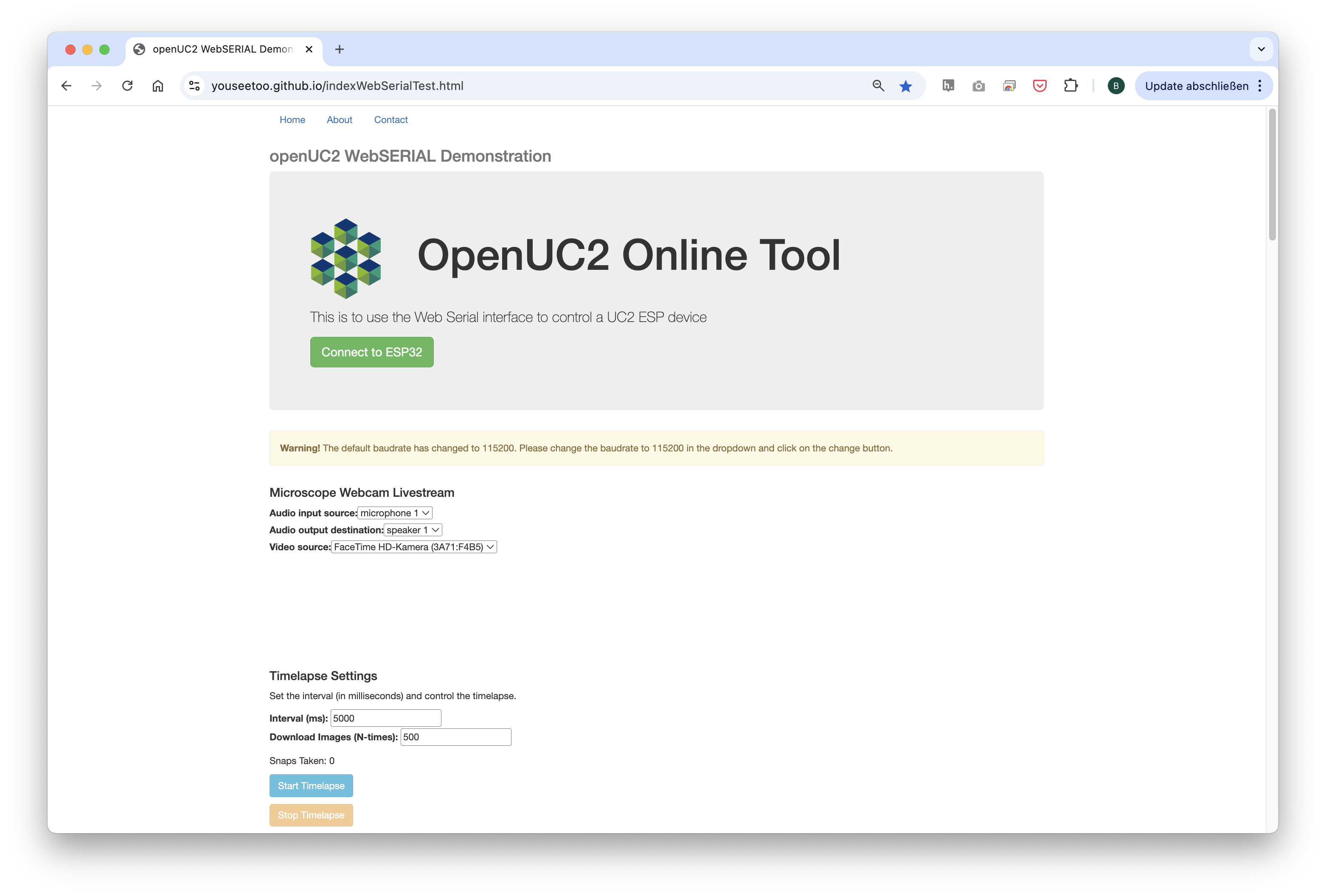 1. Before proceeding, ensure your ESP32 board has the latest firmware. You can download and flash the firmware via the official openUC2 website, selecting the your version, then then click on the connect button.