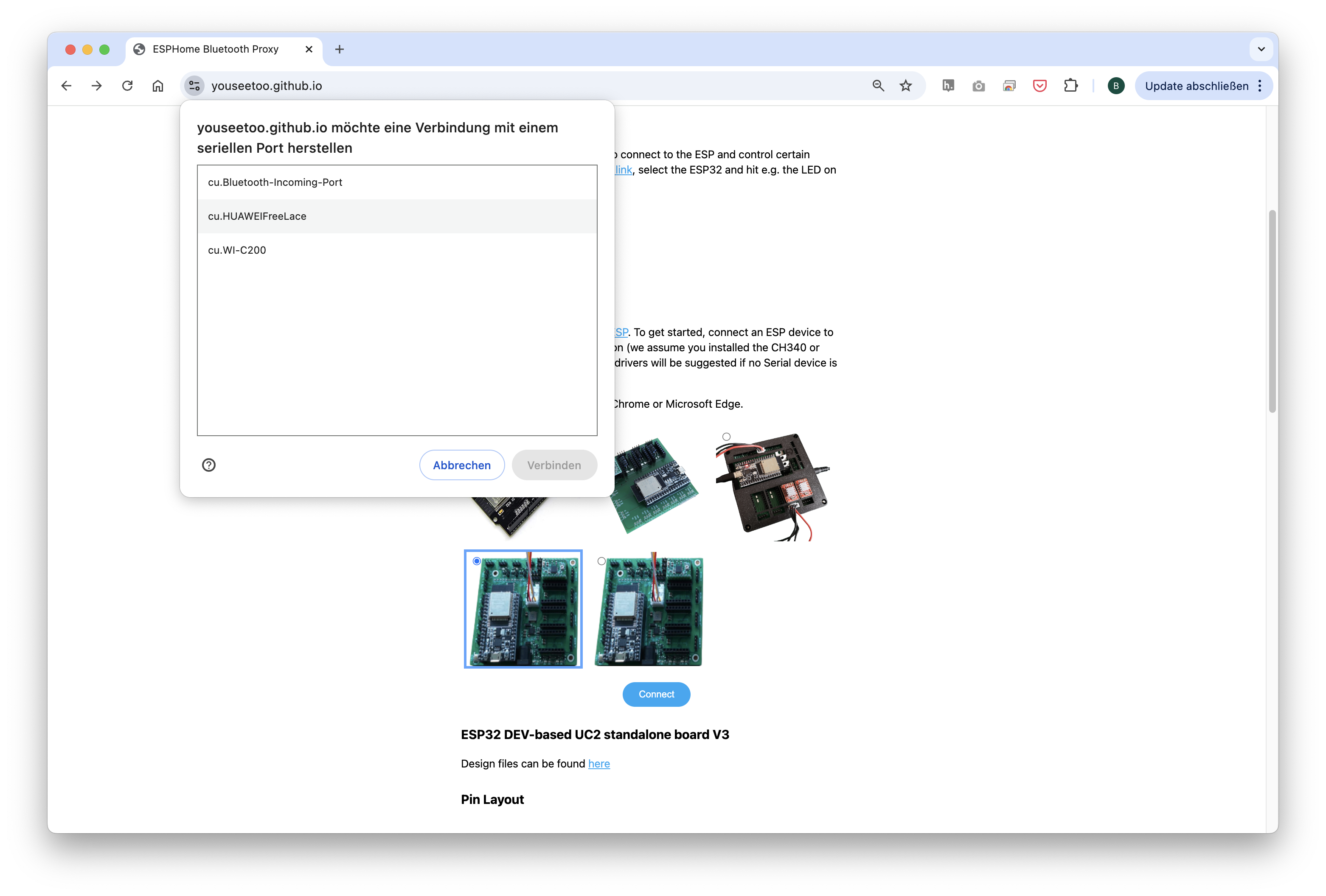 1. In your Chrome browser and click on "Connect." A dialog will prompt you to select the COM port for your ESP32. Once connected, you can install the latest firmware by simply clicking the "Install" button. If nothing shows up, you can install the drivers from the following propmpt that results when you hit anywhere on the screen: