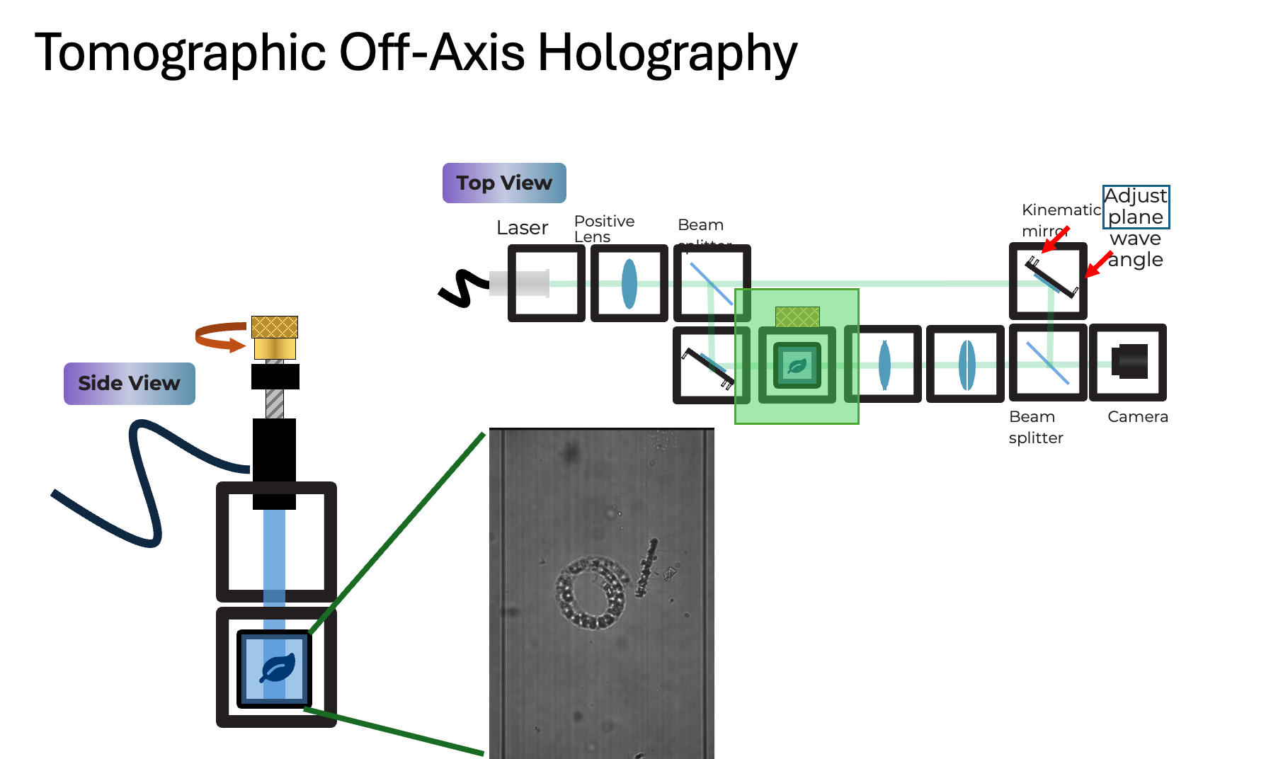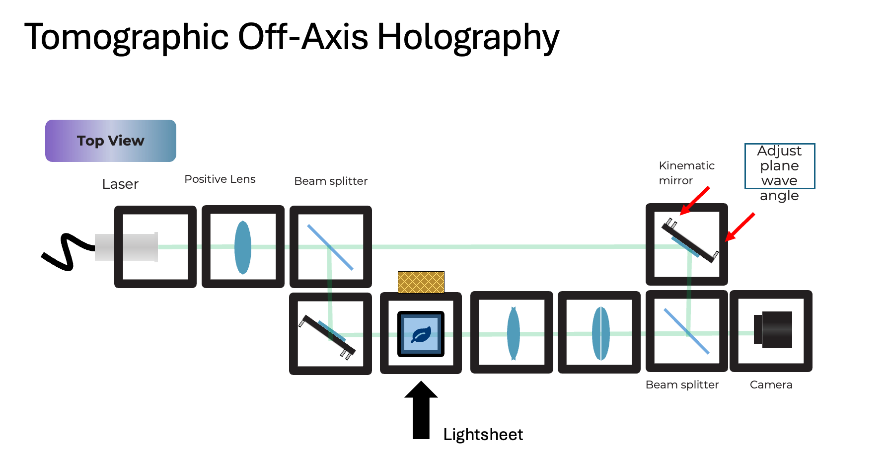 Goal: interfere a tilted reference plane wave with the sample wave to encode the complex field into an intensity hologram (off-axis carrier). This is typically done using an off-axis or Mach-Zehnder style interferometer, where the reference and sample arms are completely separate before recombination. This allows for greater flexibility in sample insertion (FEP tube) and better control over the reference tilt compared to a Michelson design. The sample part has an infinity-based microscope with an objective lens and a tube lens that images the sample on the camera. The reference arm has a kinematic mirror cube that allows fine adjustment of the reference wave tilt, which controls the fringe frequency and direction in the hologram. By rotating the sample (FEP tube) and acquiring holograms at multiple angles, we can perform tomographic reconstruction to recover the 3D refractive index distribution of the sample.
