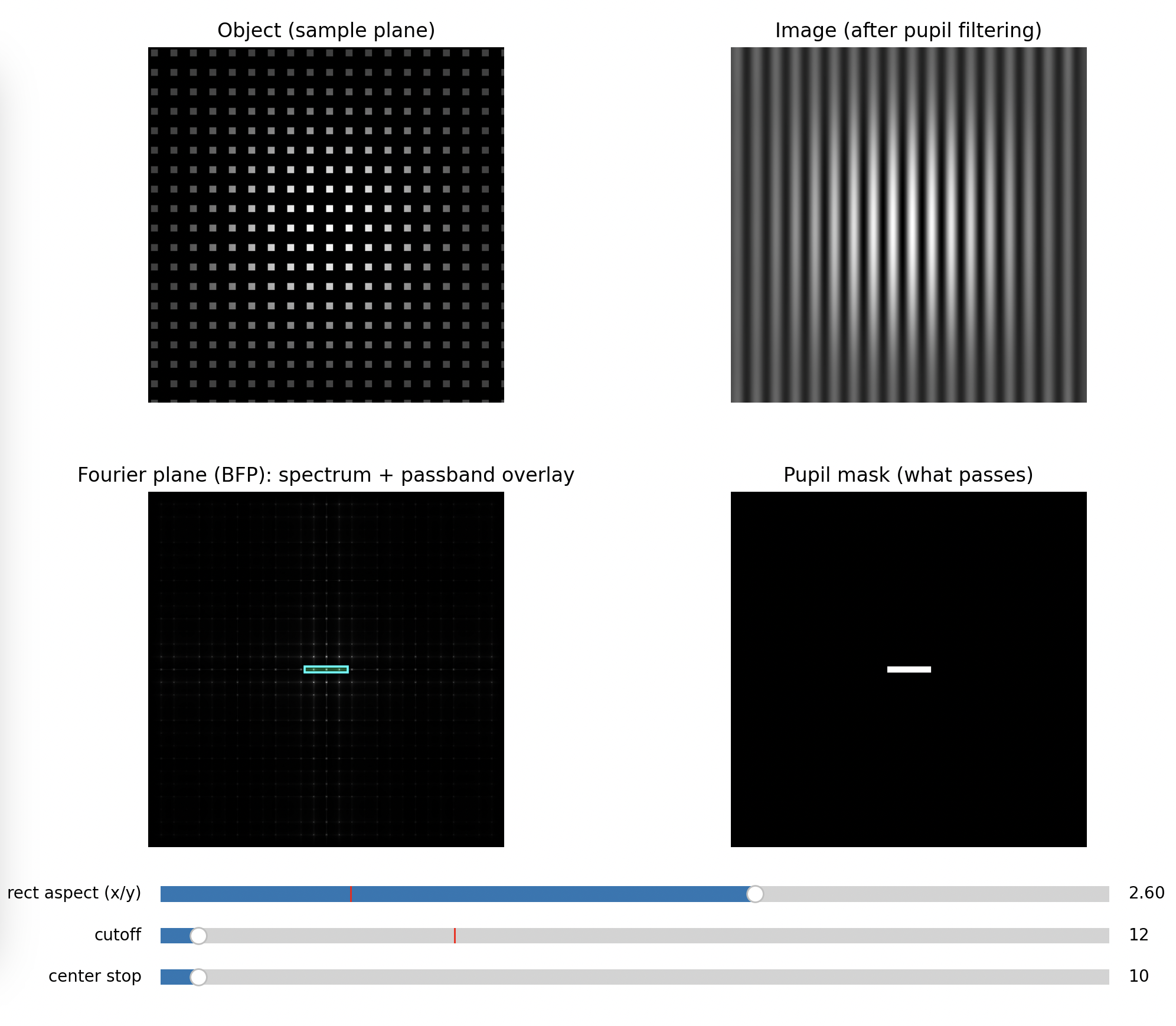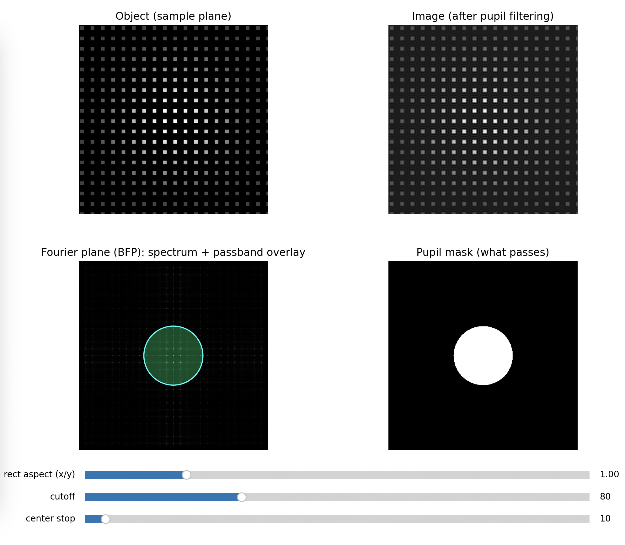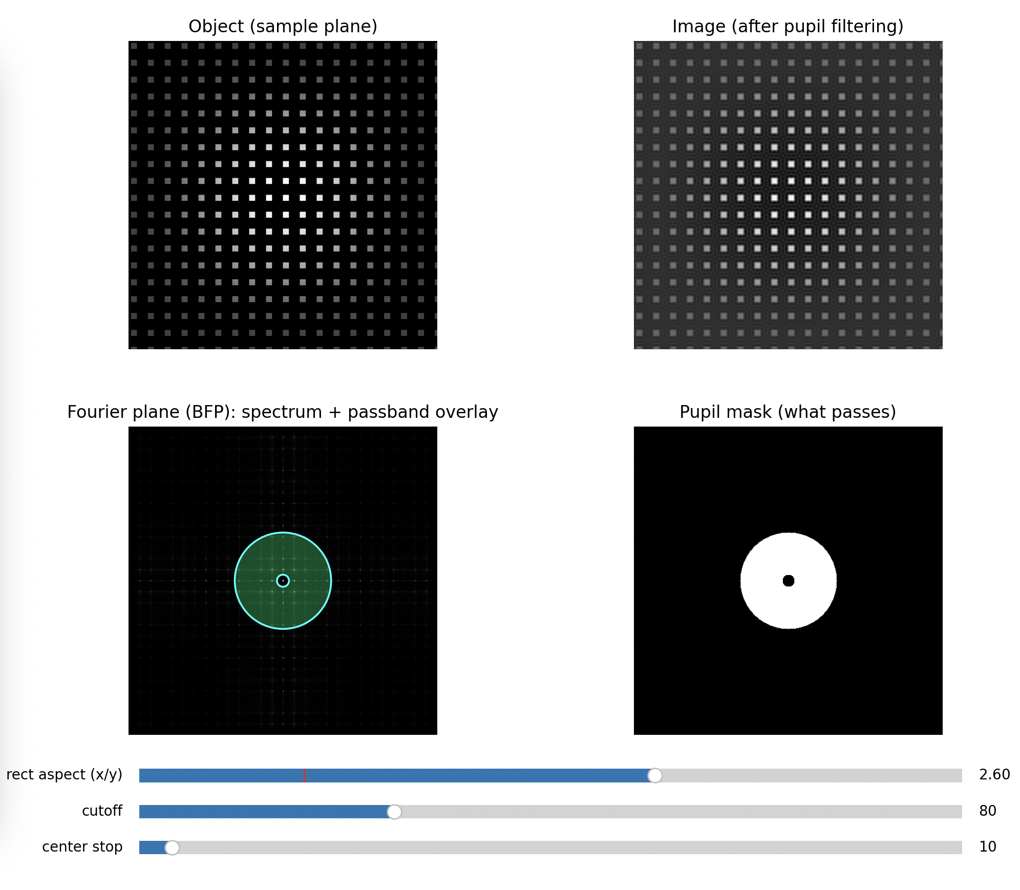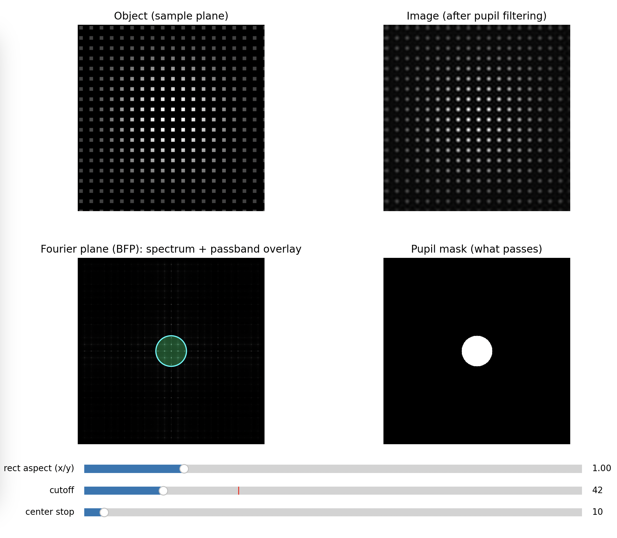 This is why the illumination model matters: the same optics can behave as if they had a different “information bandwidth” depending on coherence. Your UC2 setup makes this tangible because you can see and edit the frequency content directly in the BFP.