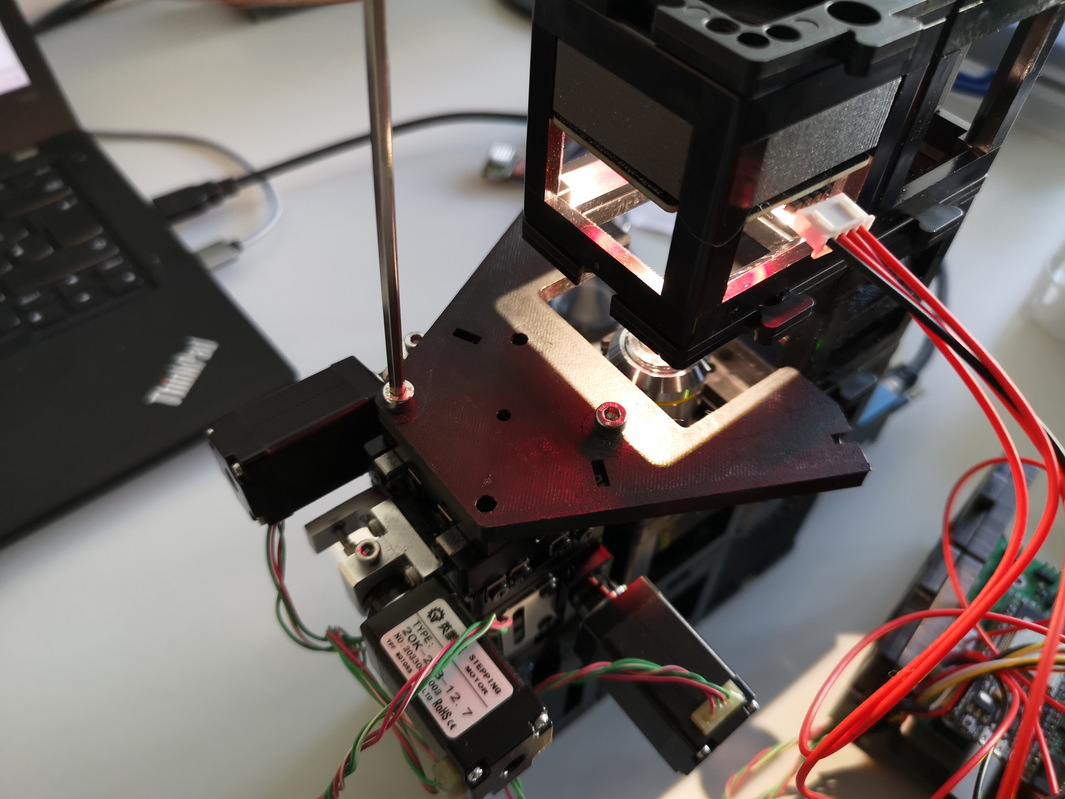 Fully assembled XYZ stage with high precision stepper motors, designed for seamless automation in microscopy setups.