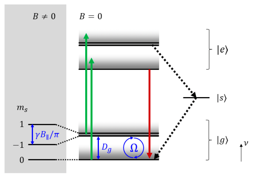 • A static magnetic field along the NV axis causes a Zeeman effect, further splitting $|g,+1⟩$ and $|g,-1⟩$.